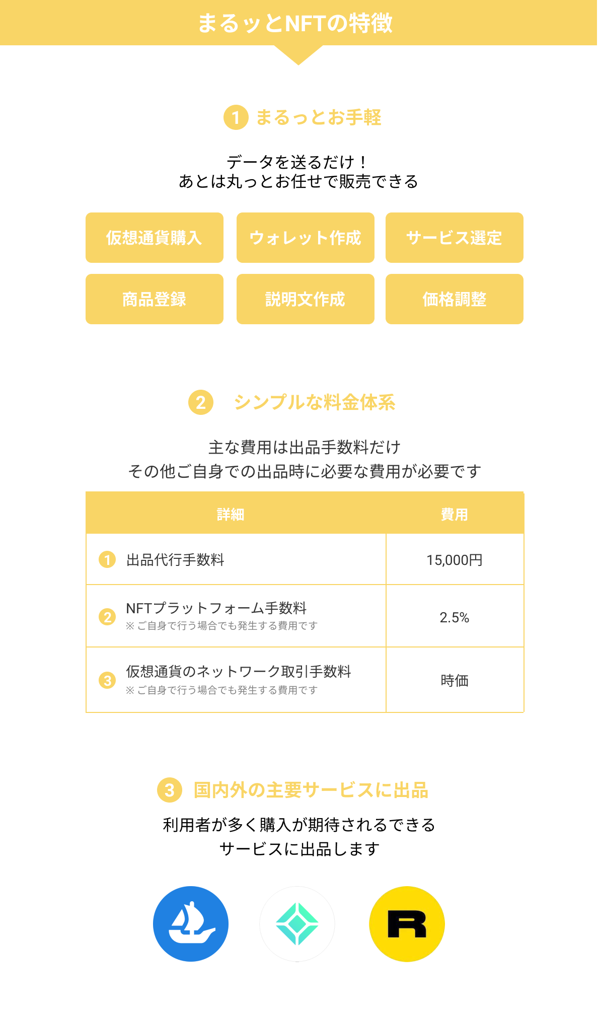 OpenSea(オープンシー),Rarible(ラリブル),Coincheck(コインチェック),SuperRare(スーパーレア),Nifty Gateway(ニフティゲートウェイ),Foundation,Axie Marketplace(アクシーマーケットプレイス),BakerySwap(ベーカリースワップ),NFT ShowRoom(NFTショールーム),VIV3,PlayAsset(プレイアセット),MakersPlace(メーカープレイス),Nanakusa(ナナクサ),Enjin MarketPlace(エンジンマーケットプレイス),nanakusa(ナナクサ)など、NFTマーケットプレイスを実際に使用した方の評判や使い方を掲載しております。 中立・公平性を維持するために弊社では初心者、経験者と幅広い方の意見を参考にしているため、他のサイトよりも信頼性が高いと評判です。