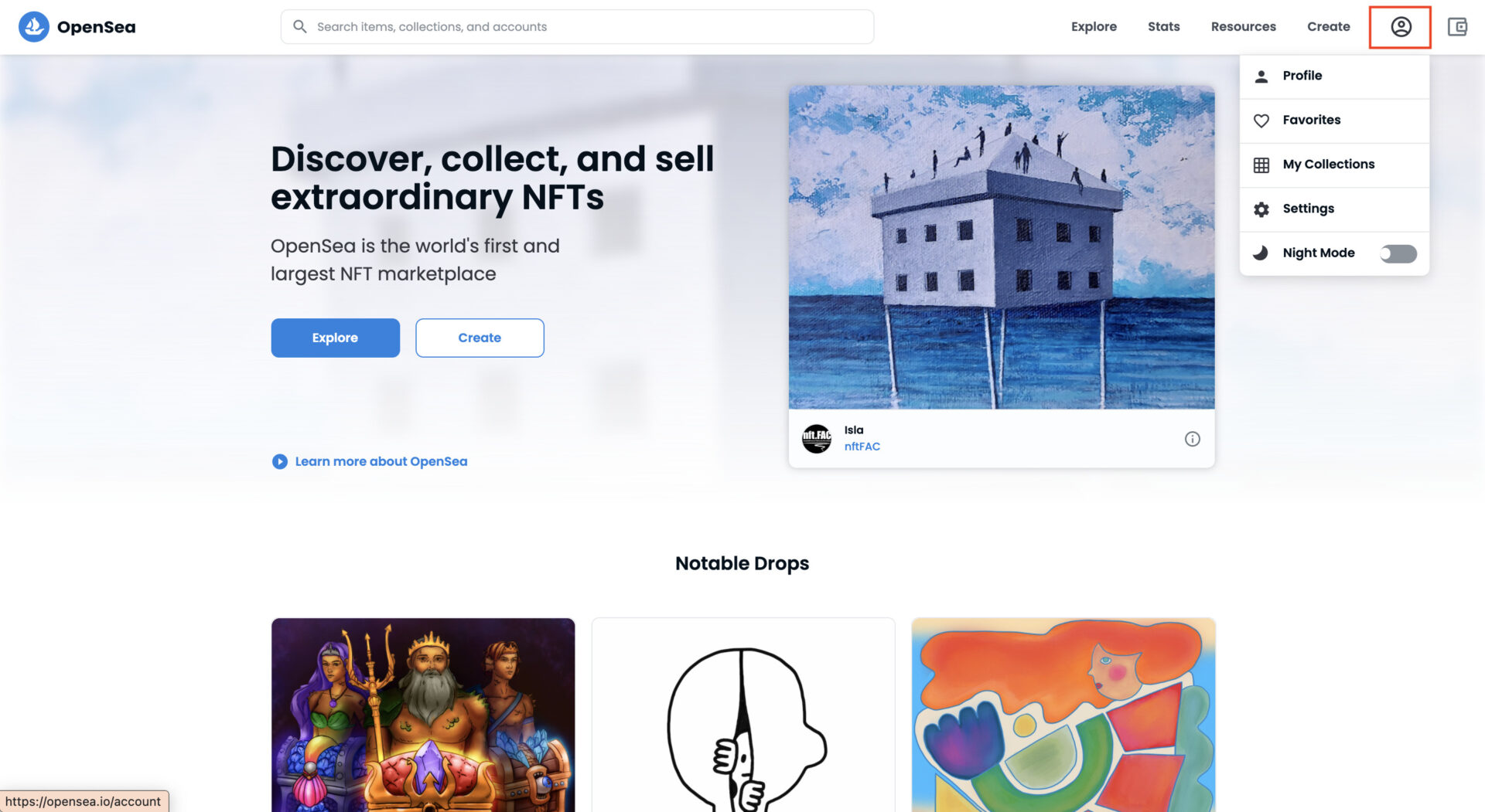 OpenSeaのトップページから「プロフィール」をクリック。