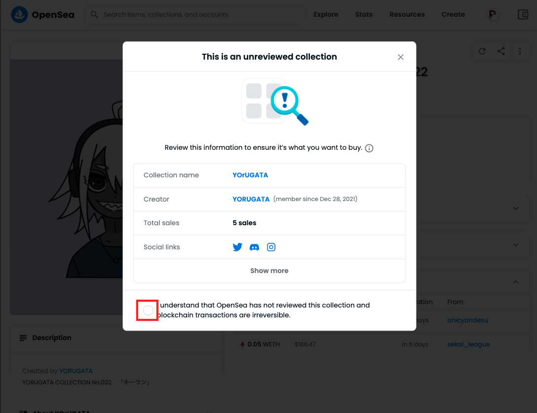 OpenSeaでは、フィッシング詐欺や有名クリエイターを名乗る偽物が出品している可能性もあるため、注意が必要です。
