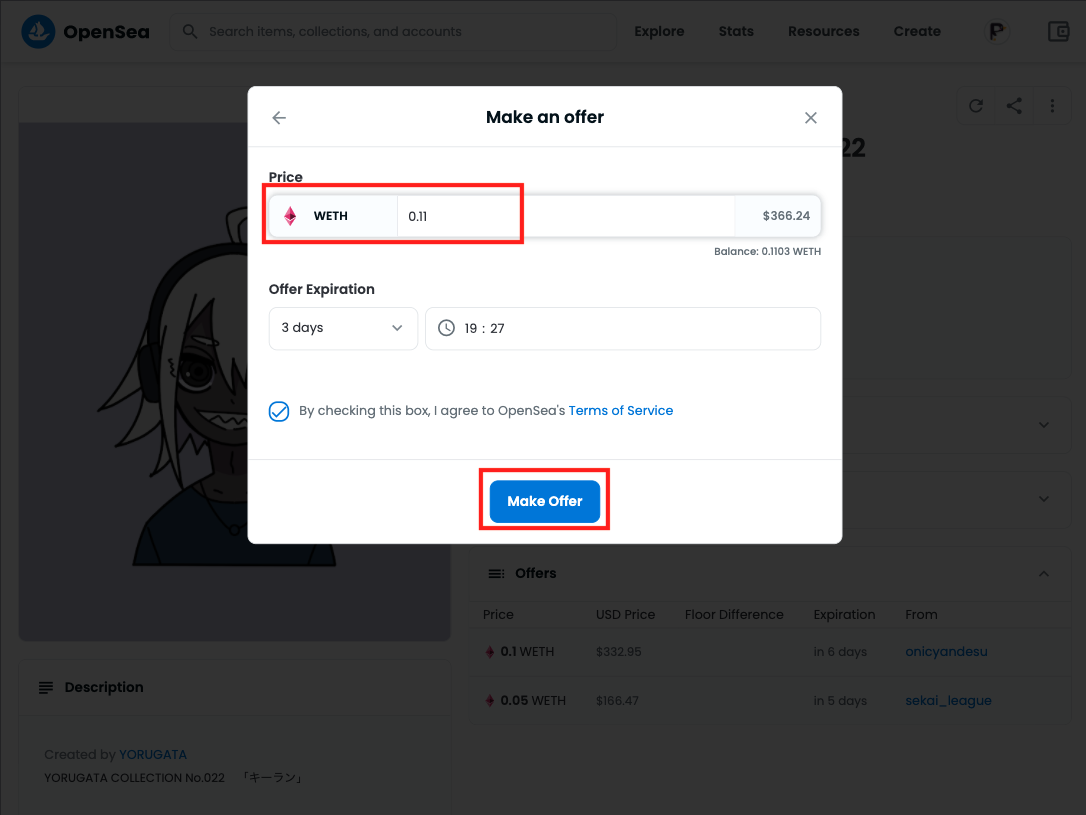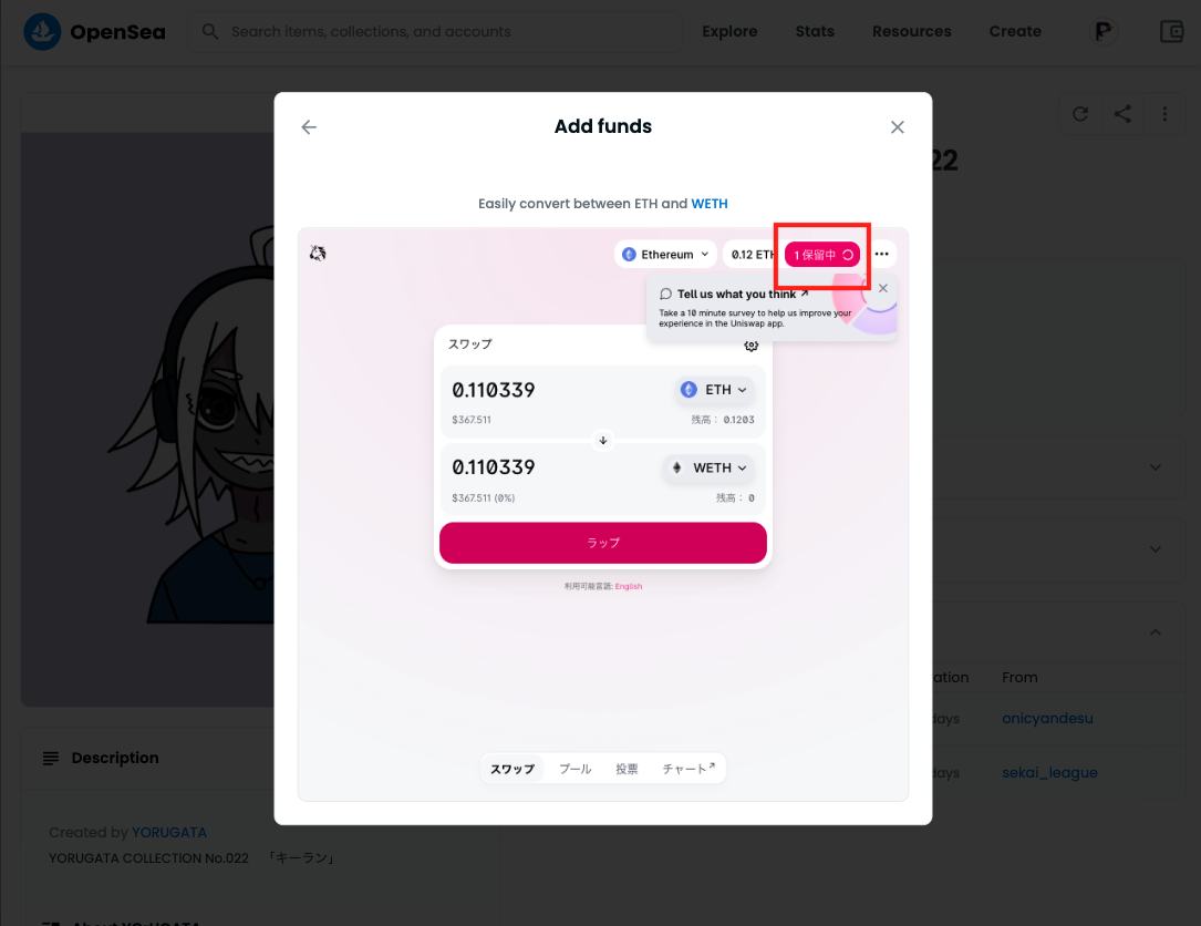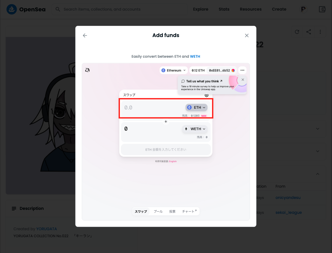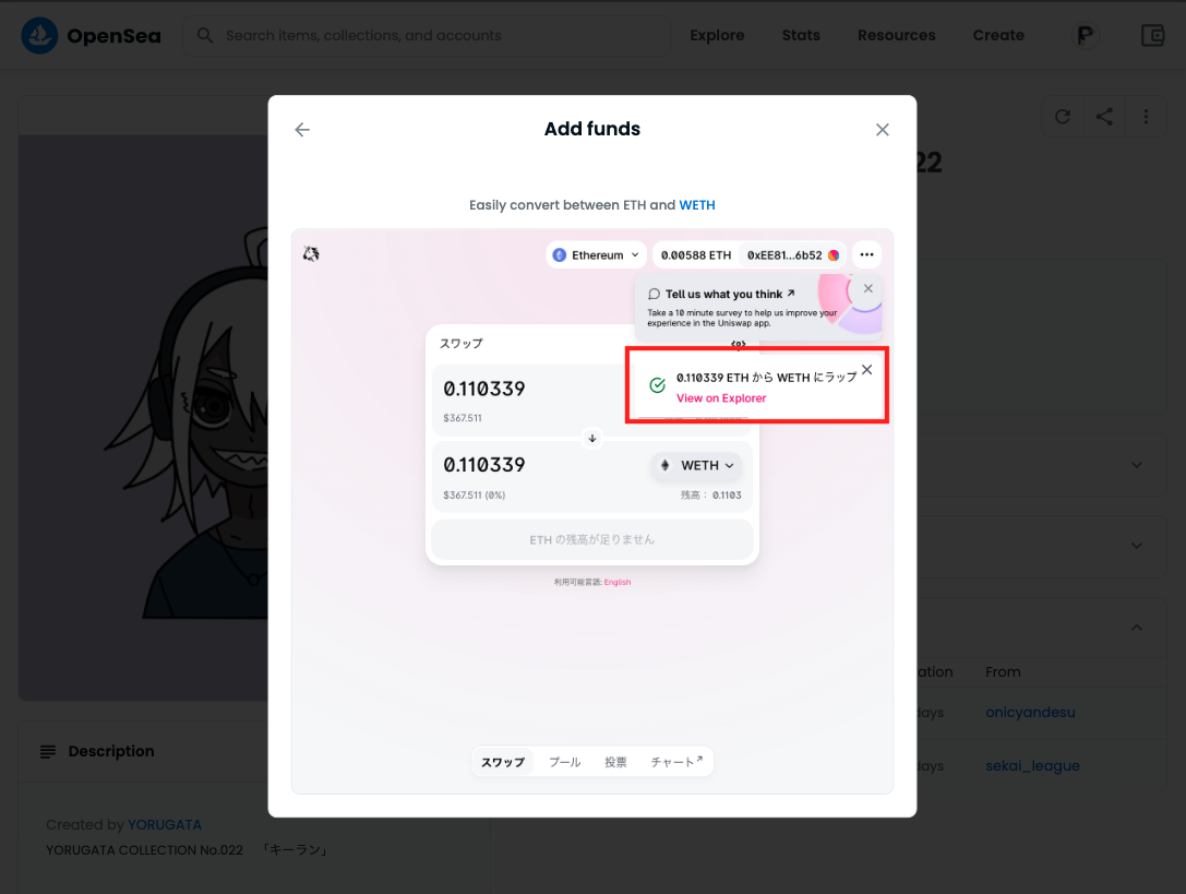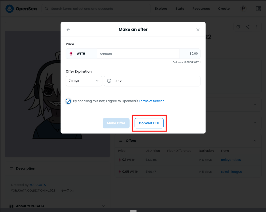 WETHの購入・変換方法は「OpenSeaでオファー時のNFTの買い方」で画像付きで解説します。