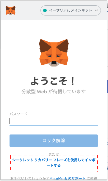 - ログイン画面の下側にある「シークレット リカバリー フレーズを使用してインポートする」を選択する