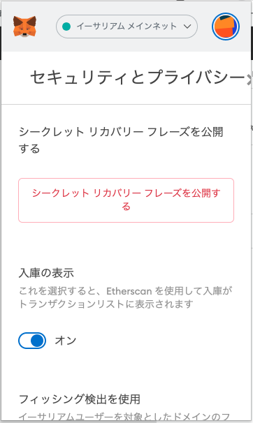 設定画面の中から「シークレットリカバリーフレーズを公開する」をクリックします。