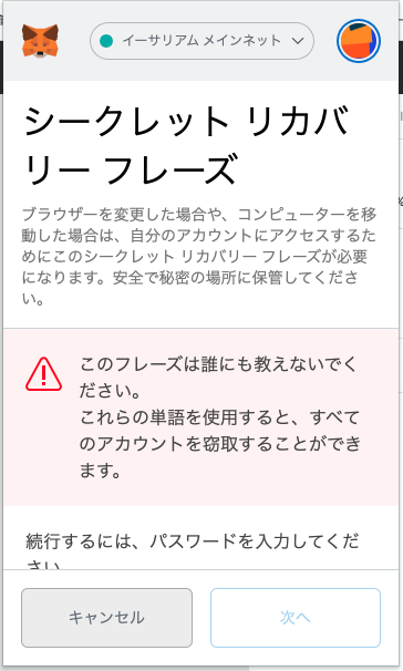 パスワードを要求されるので、普段MetaMaskにログインする際に使っているパスワードを入力してください。するとパスフレーズが画面に表示されます。
