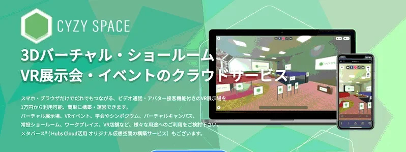 | CYZY SPACE | スマホやブラウザだけでつながる、ビデオ通話・アバター接客機能付きのVR展示場が1万円から利用可能で、簡単に構築・運営できます。 |