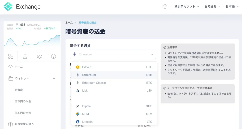 暗号資産の名称が出てくるため、「送金する通貨」をクリックし「イーサリアム」を選択。