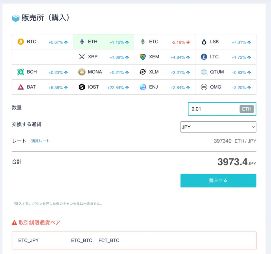 暗号資産の名称が出てくるため、「イーサリアム」を選択して「購入」をクリック。